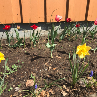 I haust sat gruppe 1 blomsterløk i beddene, no kjem det tulipanar og andre blomstrar. Elevane i gruppe 1 held oversikta kor mange det blir og sørgjer for vatning.